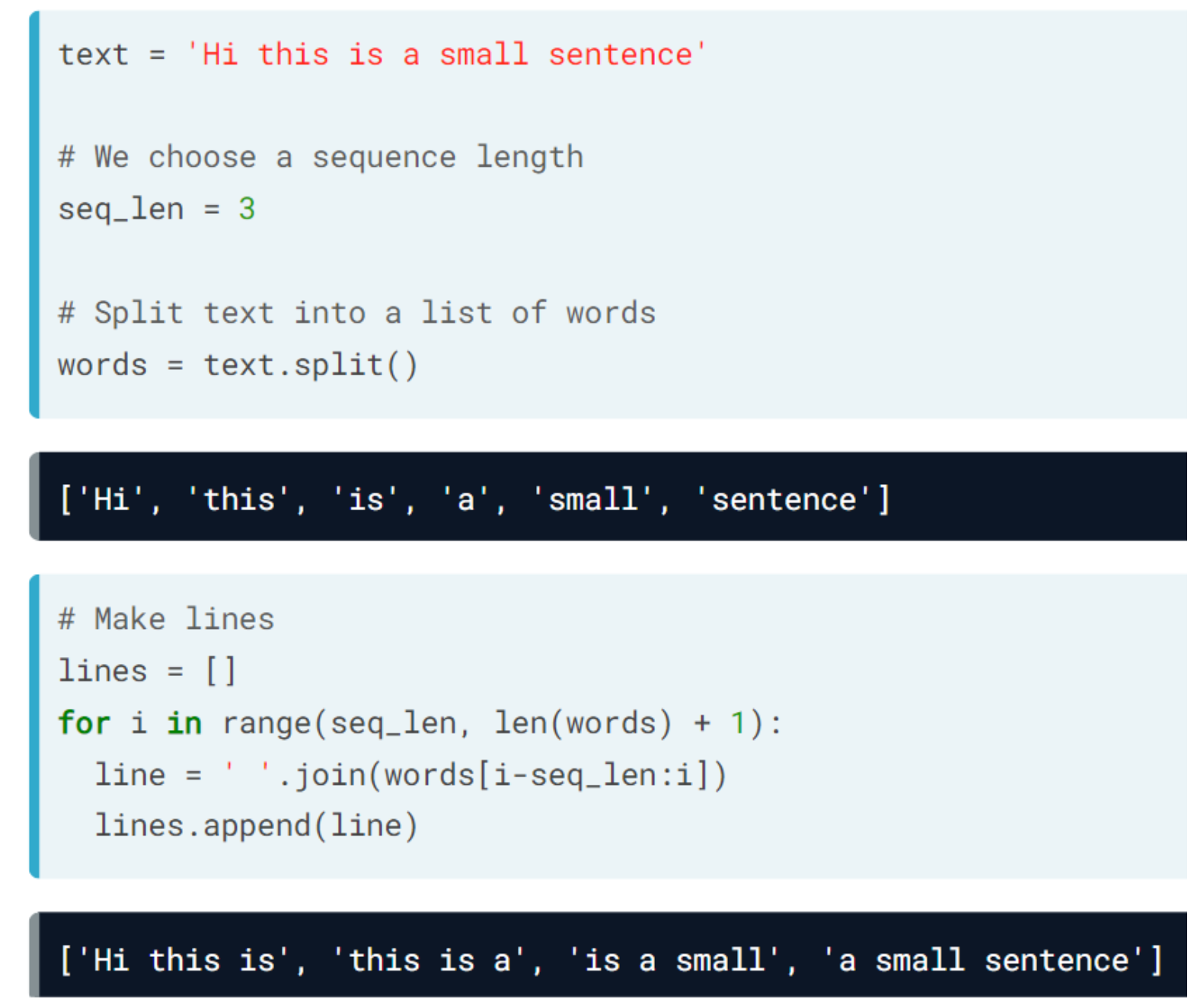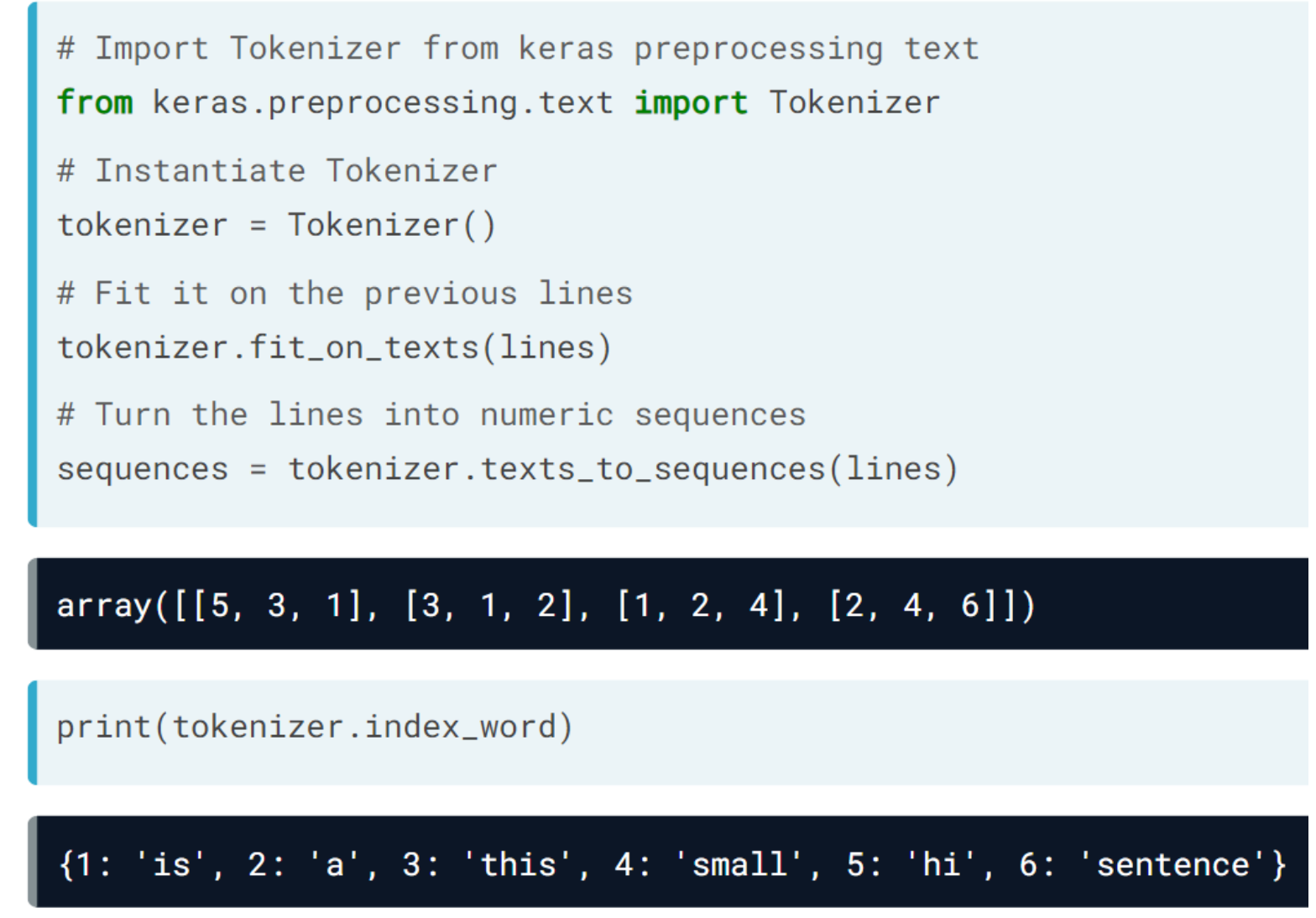 print("Sentences: \n {} \n Sequences: \n {}".format(sentences[:5], sequences[:5]))Sentences: