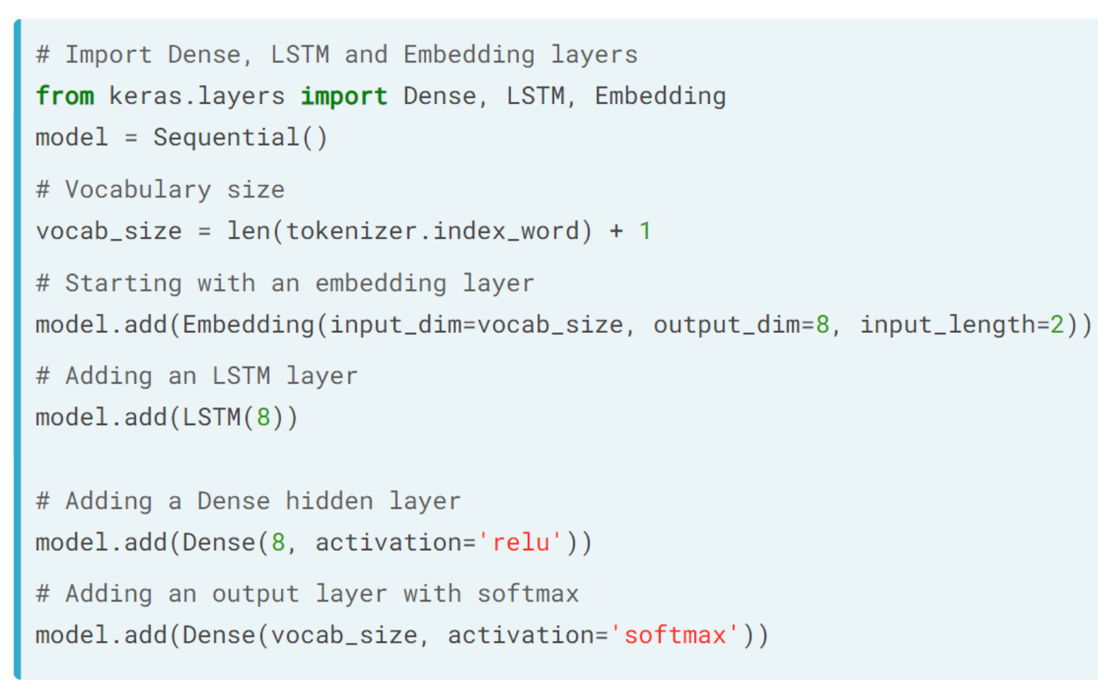 Remember your sequences had 4 words each, your model will be trained on the first three words of each sequence, predicting the 4th one. You are going to use an Embedding layer that will essentially learn to turn words into vectors. These vectors will then be passed to a simple LSTM layer. Our output is a Dense layer with as many neurons as words in the vocabulary and softmax activation. This is because we want to obtain the highest probable next word out of all possible words.