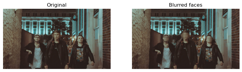 plot_comparison(group_image_o, resulting_image, 'Blurred faces')/var/folders/gk/g6hht_993hbcv0ffg5wyh8f00000gn/T/ipykernel_5012/3288260764.py:17: FutureWarning: `multichannel` is a deprecated argument name for `gaussian`. It will be removed in version 1.0. Please use `channel_axis` instead.