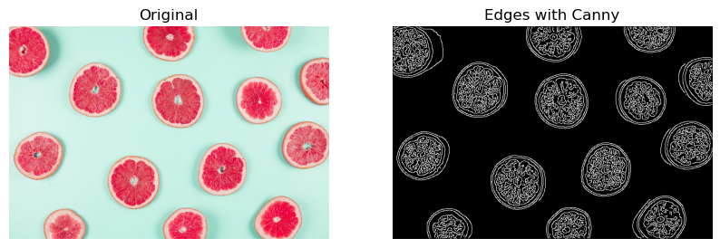 plot_comparison(grapefruit, canny_edges, "Edges with Canny")