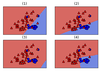 for clf, ax, title in zip(clfs, sub.flatten(), ("(1)", "(2)", "(3)", "(4)")):
