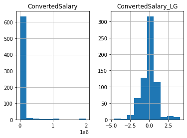 Above you scaled the data linearly, which will not affect the data’s shape. This works great if your data is normally distributed (or closely normally distributed), an assumption that a lot of machine learning models make. Sometimes you will work with data that closely conforms to normality, e.g the height or weight of a population. On the other hand, many variables in the real world do not follow this pattern e.g, wages or age of a population. In this exercise you will use a log transform on the ConvertedSalary column in the so_numeric_df DataFrame as it has a large amount of its data centered around the lower values, but contains very high values also. These distributions are said to have a long right tail