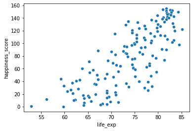 In this exercise, you’ll examine the relationship between a country’s life expectancy (life_exp) and happiness score (happiness_score) both visually and quantitatively.