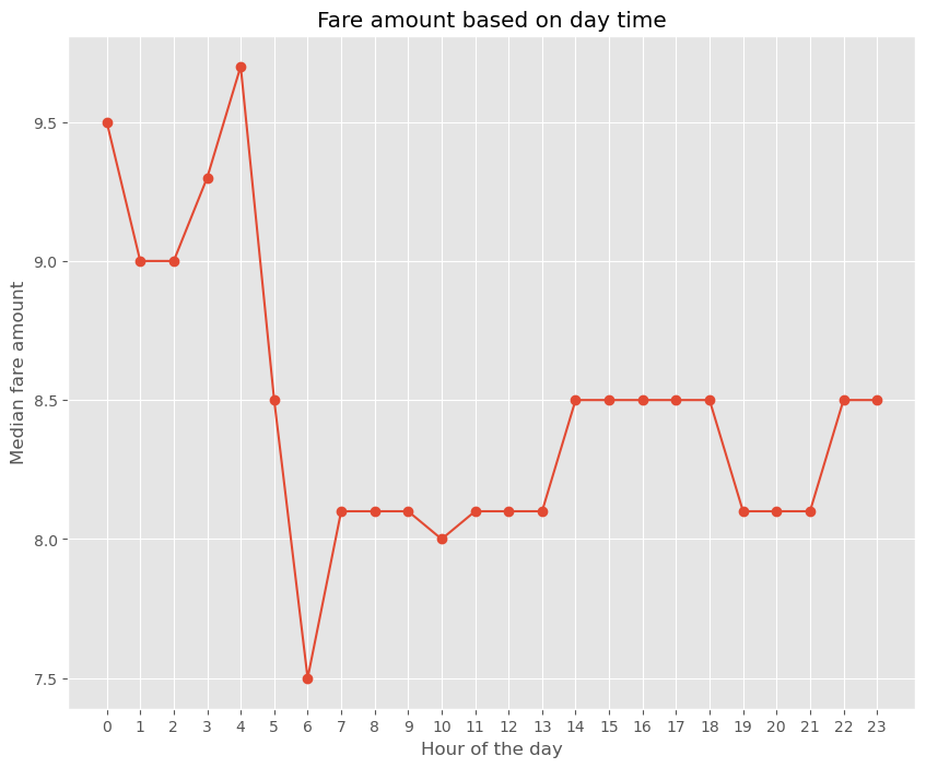 Your goal is to plot the median fare amount for each hour of the day as a simple line plot.