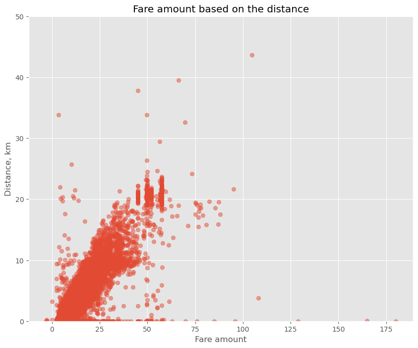 To begin with, let’s make a scatterplot plotting the relationship between the fare amount and the distance of the ride. Intuitively, the longer the ride, the higher its price.