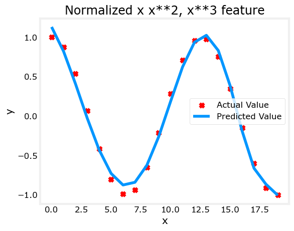 plt.scatter(x, y, marker=‘x’, c=‘r’, label=“Actual Value”); plt.title(“Normalized x x2, x3 feature”) plt.plot(x,X@model_w + model_b, label=“Predicted Value”); plt.xlabel(“x”); plt.ylabel(“y”); plt.legend(); plt.show()