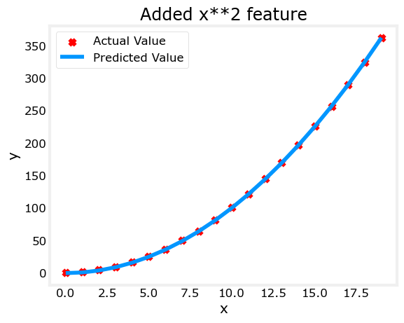 Above, it is clear that the \(x^2\) feature mapped against the target value \(y\) is linear. Linear regression can then easily generate a model using that feature.