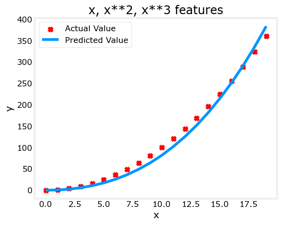 Above, we knew that an \(x^2\) term was required. It may not always be obvious which features are required. One could add a variety of potential features to try and find the most useful. For example, what if we had instead tried : \(y=w_0x_0 + w_1x_1^2 + w_2x_2^3+b\) ?