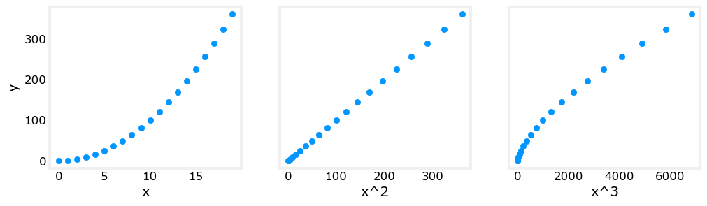 Above, polynomial features were chosen based on how well they matched the target data. Another way to think about this is to note that we are still using linear regression once we have created new features. Given that, the best features will be linear relative to the target. This is best understood with an example.