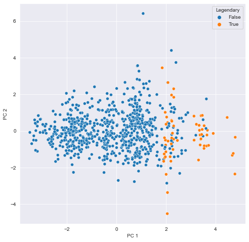 Looks like the different types are scattered all over the place while the legendary Pokemon always score high for PC 1 meaning they have high stats overall. Their spread along the PC 2 axis tells us they aren’t consistently fast and vulnerable or slow and armored.