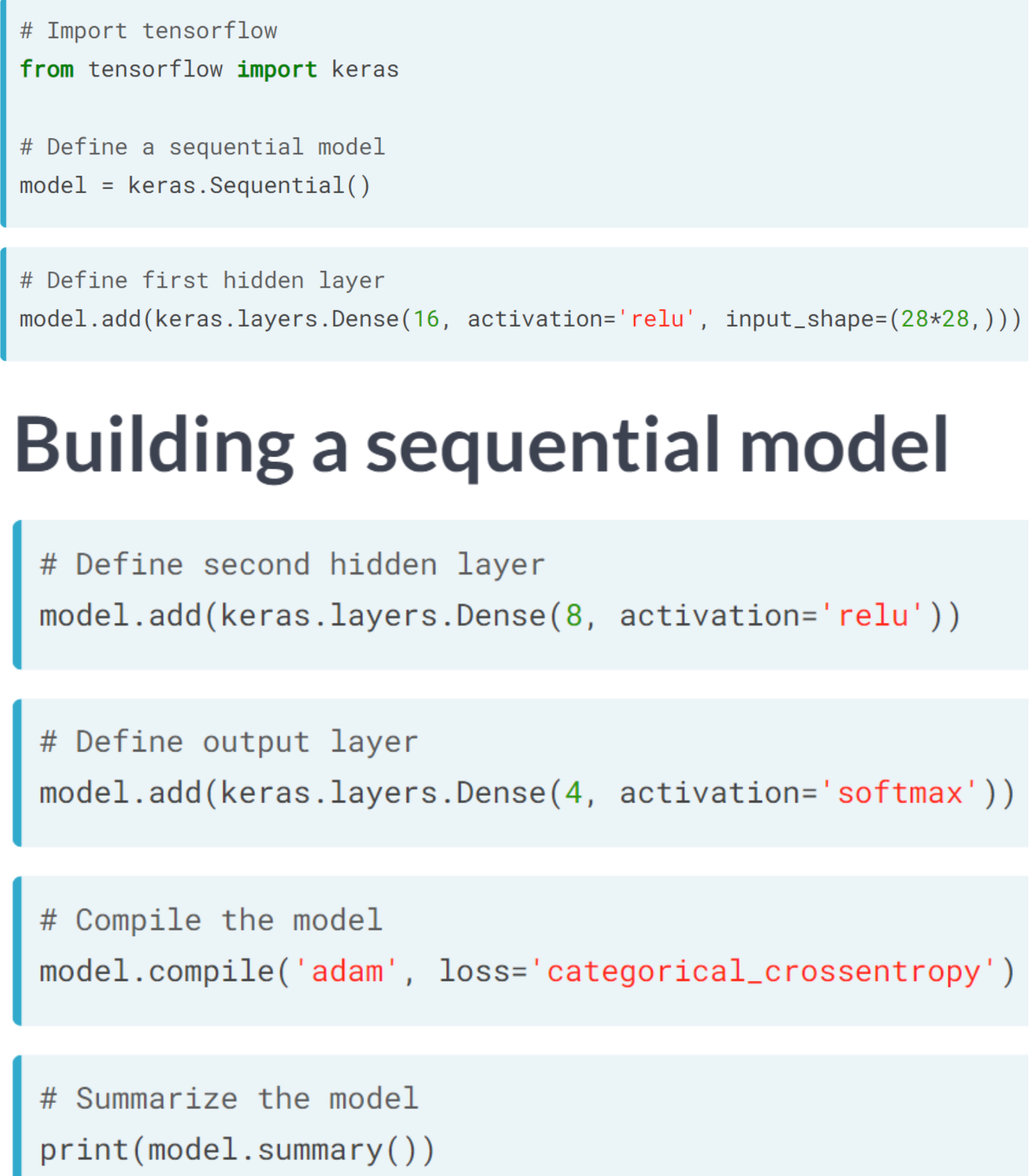 n chapter 3, we used components of the keras API in tensorflow to define a neural network, but we stopped short of using its full capabilities to streamline model definition and training. In this exercise, you will use the keras sequential model API to define a neural network that can be used to classify images of sign language letters. You will also use the .summary() method to print the model’s architecture, including the shape and number of parameters associated with each layer.