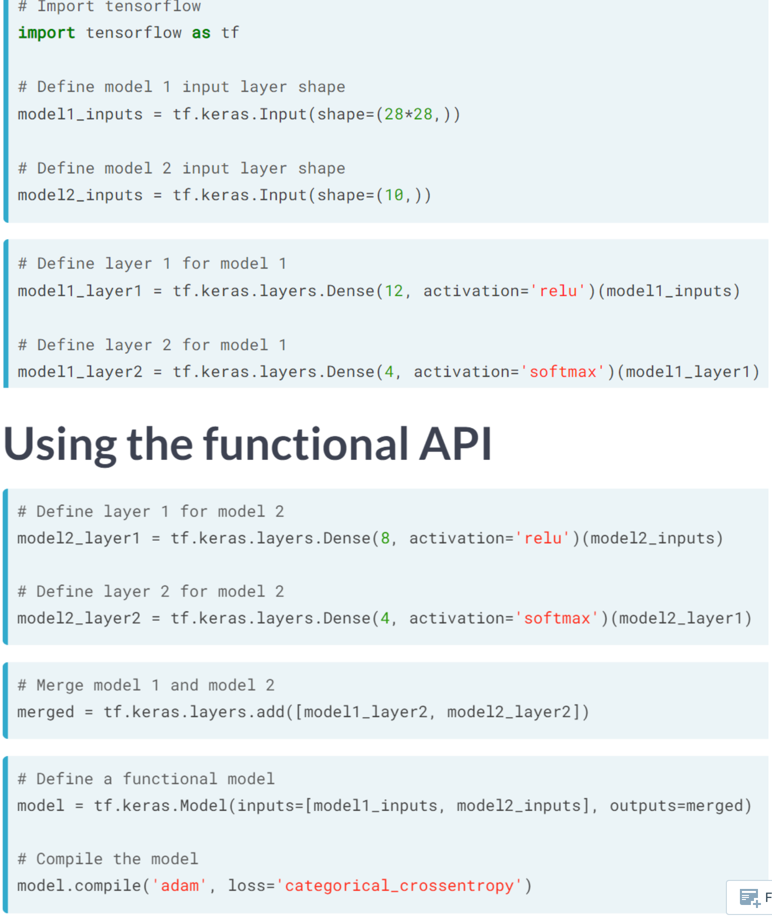 In some cases, the sequential API will not be sufficiently flexible to accommodate your desired model architecture and you will need to use the functional API instead. If, for instance, you want to train two models with different architectures jointly, you will need to use the functional API to do this. In this exercise, we will see how to do this. We will also use the .summary() method to examine the joint model’s architecture.