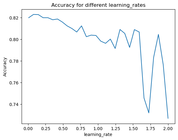 plt.gca().set(xlabel='learning_rate', ylabel='Accuracy', title='Accuracy for different learning_rates');