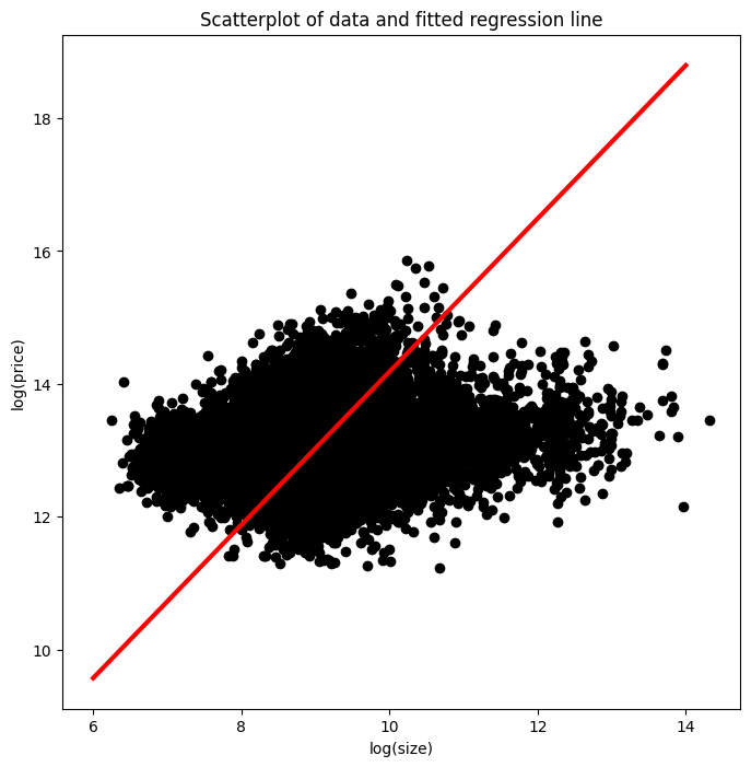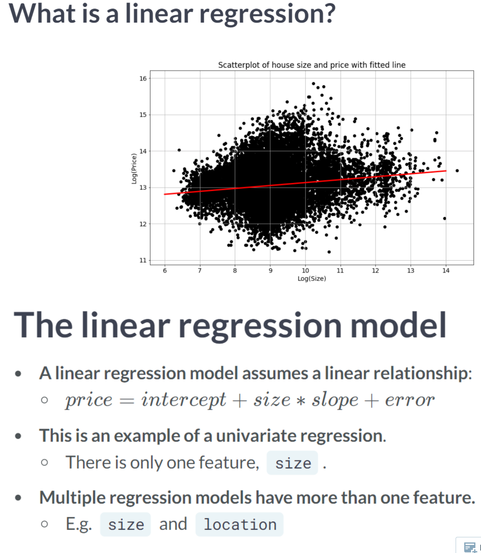 The univariate linear regression method identifies the relationship between a single feature and the target tensor. We will use the lot size and price of a property in this exercise. As discussed in the video, we will take the natural logarithms of both tensors, which are available as price_log and size_log.