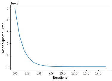 As you can see, the mean squared error decreases as the number of iterations go up.