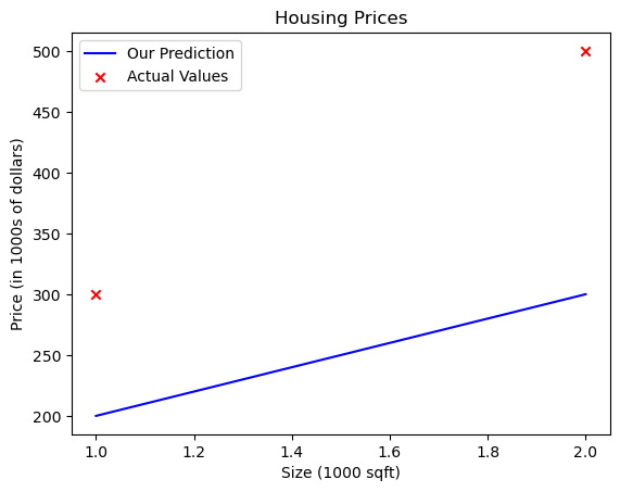 As in the lecture, you will use the motivating example of housing price prediction. This lab will use a simple data set with only two data points - a house with 1000 square feet(sqft) sold for \$300,000 and a house with 2000 square feet sold for \$500,000. These two points will constitute our data or training set. In this lab, the units of size are 1000 sqft and the units of price are 1000s of dollars.