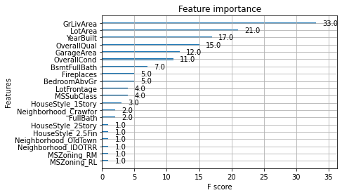 print("\nHave a look at each of the plots. They provide insight into how the model arrived at its final decisions and what splits it made to arrive at those decisions. This allows us to identify which features are the most important in determining house price. In the next exercise, you'll learn another way of visualizing feature importances.")ExecutableNotFound: failed to execute WindowsPath('dot'), make sure the Graphviz executables are on your systems' PATH