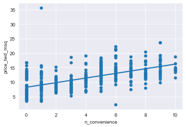 We’ll look at the relationship between house price per area and the number of nearby convenience stores using the Taiwan real estate dataset.