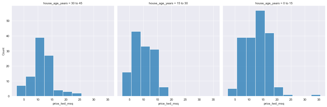 # Histograms of price_twd_msq with 10 bins, split by the age of each house