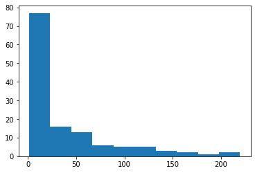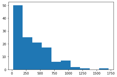 plt.hist(food_consumption[food_consumption['food_category']=='beef']['co2_emission'])