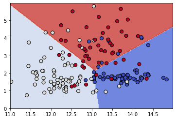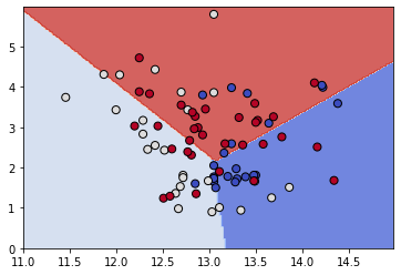 plot_classifier(X, y, svm, lims=(11, 15, 0, 6))