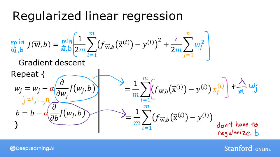 Including this term encourages gradient descent to minimize the size of the parameters. Note, in this example, the parameter \(b\) is not regularized. This is standard practice.