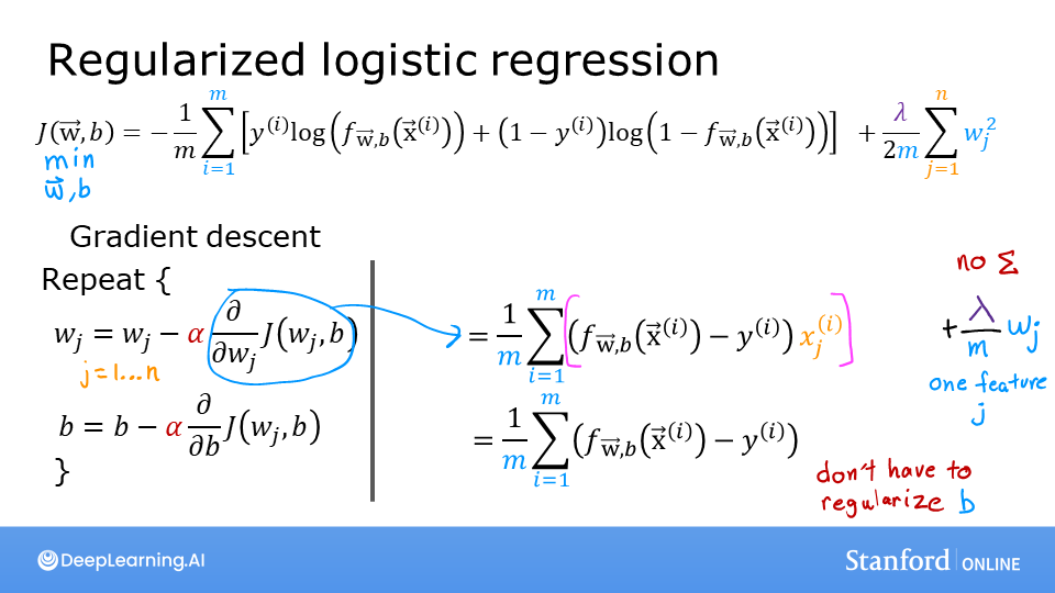 As was the case in linear regression above, the difference is the regularization term, which is \(\frac{\lambda}{2m} \sum_{j=0}^{n-1} w_j^2\)
