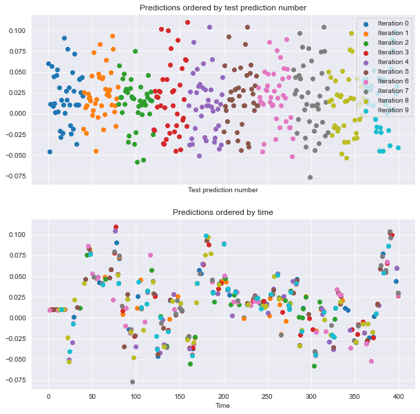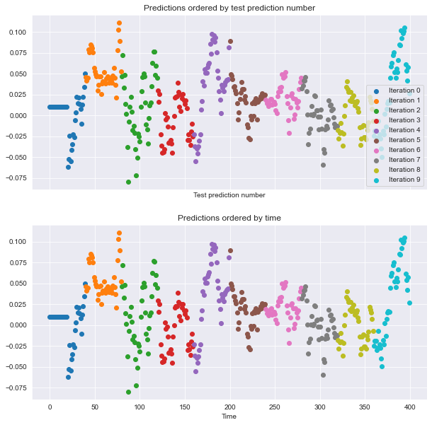 axs[0].set(xlabel="Test prediction number", title="Predictions ordered by test prediction number")