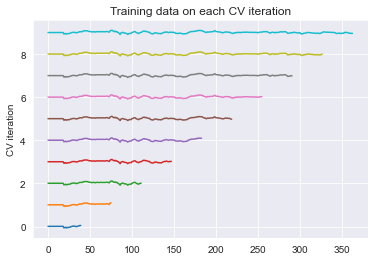 ax.set(title='Training data on each CV iteration', ylabel='CV iteration');
