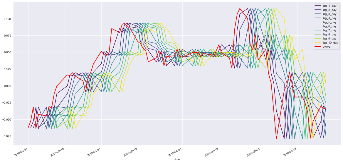 prices_perc['AAPL'].shift(day_shift) for day_shift in shifts}
